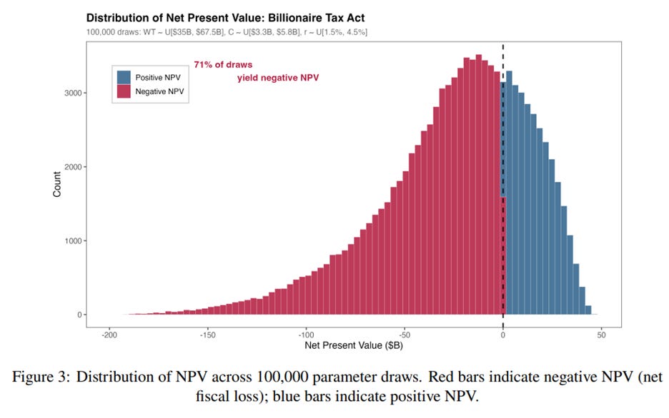 Across a broad range of assumptions about revenue, discount rates and income tax losses, the authors estimate an average net present value for this wealth tax of negative $24.7 billion. In their simulations, 71% of plausible outcomes produce a negative fiscal result (see figure from the report below). The state gets an upfront payment, but the present value of forgone future income tax collections is often larger.