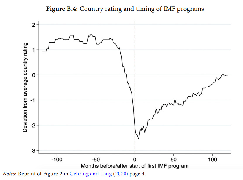 The second and even deeper problem is that correlation is not causation. Countries do not enter IMF and World Bank programs at random. They typically do so when they are already in severe economic distress: fiscal crisis, balance-of-payments pressure, debt problems, inflation, external shocks or political instability. In other words, the countries that receive these programs are often already on a downward trajectory, as figure B.4 from Callais et al. demonstrates.