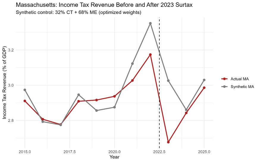 Massachusetts shows a similar, though more muted, pattern. Following the 2023 surtax, revenues initially drop below the synthetic control and only partially recover. Over 2023–2025, Massachusetts collects roughly 0.14 percentage points of GDP less than its synthetic benchmark.
