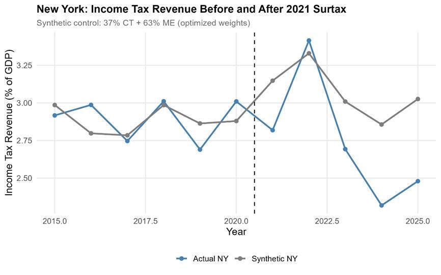 When these weights are optimized to best match pre-treatment trends, the synthetic controls track both New York and Massachusetts reasonably closely prior to their respective policy changes. This gives some confidence that the post-reform divergence is informative. After New York’s 2021 tax increase, its revenue-to-GDP ratio falls persistently below its synthetic counterpart. Averaging over 2021–2025, New York collects about 0.33 percentage points of GDP less in income tax revenue than its counterfactual benchmark would predict.