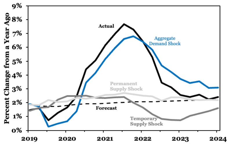 In total, aggregate demand shocks pushed the GDP deflator roughly 9% above forecast by the end of 2024, mirroring the results from the simpler NGDP approach.