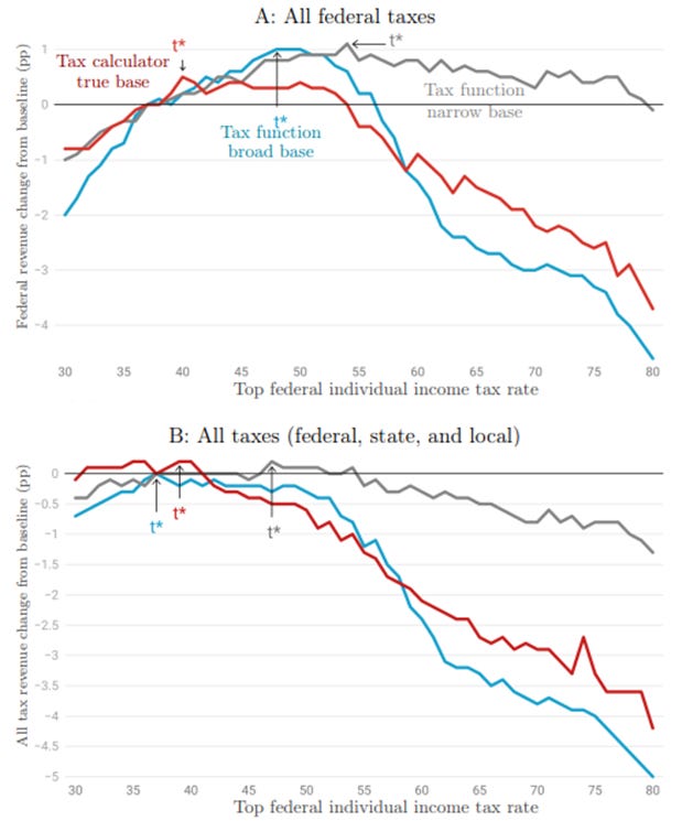 If you allow realistic cross-base shifting and the full macroeconomic feedbacks that follow, the effective ETI is larger than the 0.25 used in many headline calculations; using empirically plausible higher ETIs collapses the 73% result into much lower revenue-maximizing rates (and in some extensions, into the conclusion that raising top rates actually loses revenue when all taxes and mobility effects are accounted for).