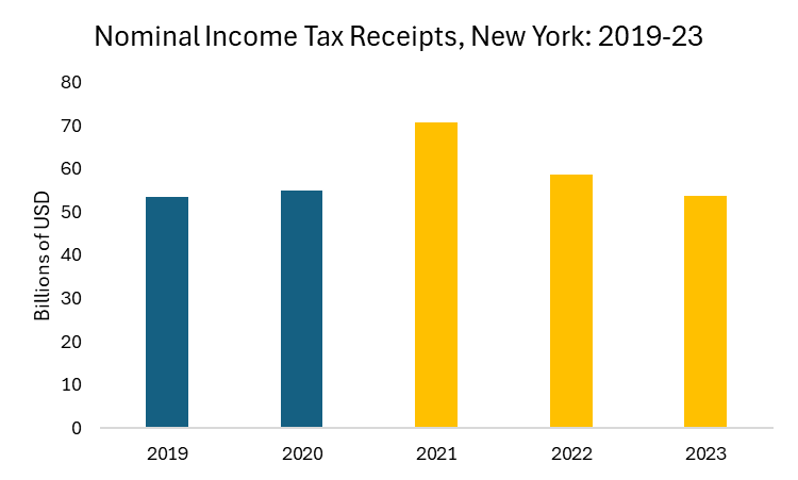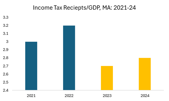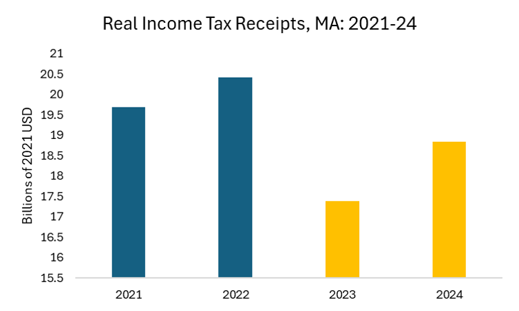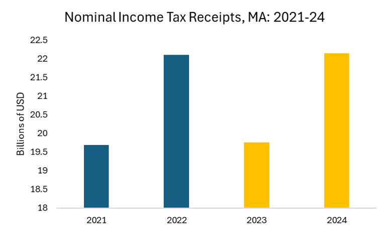 However, nominal income tax revenue (billions) actually declined in the first year the surtax was collected, before rebounding the following year. Figure 4 shows the changes in income tax receipts in Massachusetts from 2021 to 2024.