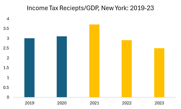 One final way to measure changes in income tax receipts is to look at these revenue figures as a share of state GDP. Figure 3 shows income tax receipts in New York as a share of the state’s gross domestic product.