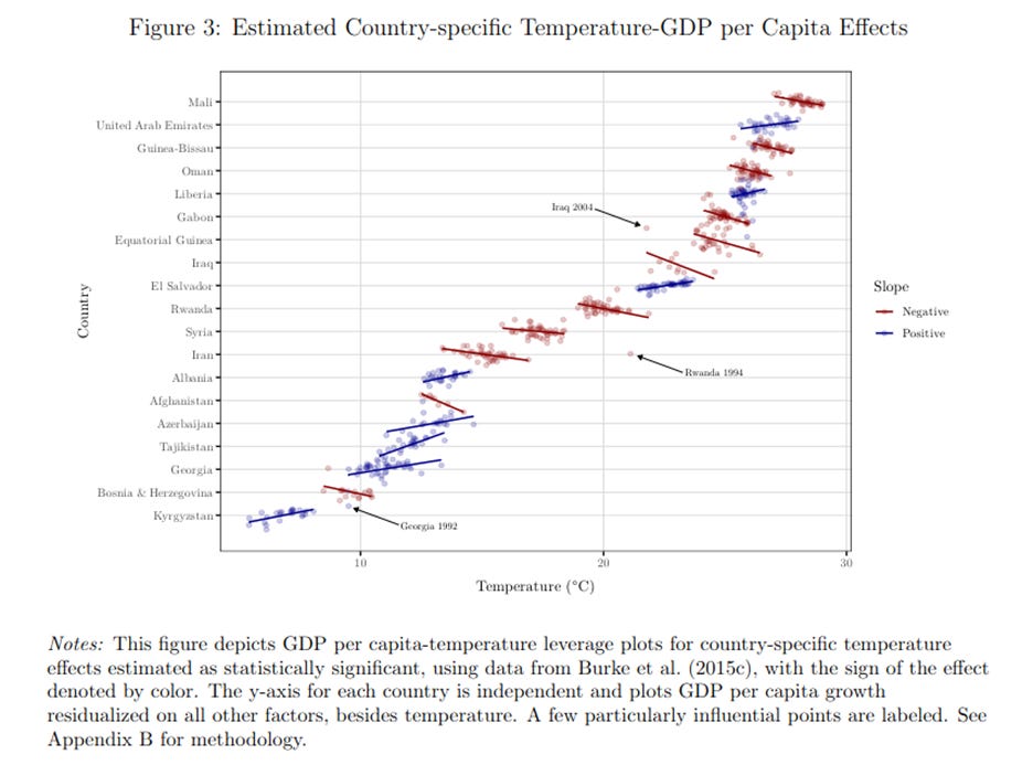 Countries with the same average temperature can have entirely different economic responses to climate variation. El Salvador and Iraq, for example, may share similar climates but have radically different economic structures, institutions, and adaptive capacities. Pooling them into a single regression implicitly assumes a common “damage function” that simply doesn’t exist (see Figure 3 below).