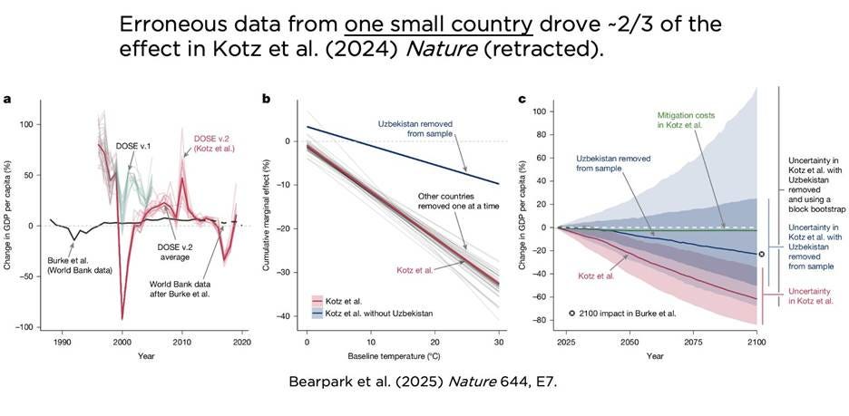 Even more striking is the example of a now-retracted Nature paper, where erroneous data from a single country, Uzbekistan, accounted for roughly two-thirds of the estimated global climate damage effect (see the 3 figures below). Mistakes do, of course, happen, but the deeper question is: how can one small country plausibly drive global conclusions in the first place?