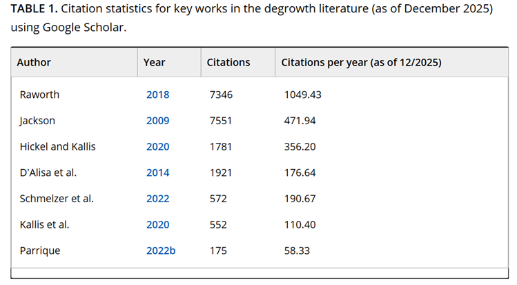 The appeal of the framework is intuitive, visually compelling and normatively attractive. Moreover, it’s not just a fringe idea in the economic and growth field—as table 1 of the Geloso et al. paper shows, it is one of the most widely cited degrowth models, gaining hundreds of new citations every year.