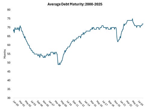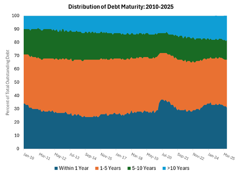 The maturity structure of public debt is a critical indicator of fiscal risk, revealing how soon the government must refinance its obligations and how vulnerable it is to changes in interest rates. The U.S. debt maturity structure is relatively short-term, meaning most of the debt is regularly rolled over into short-to-medium-term Treasuries. Figure 4 below shows the average maturity of public debt over time since 2000. This data is sourced from the latest Quarterly Refunding Documents (Treasury Dept). Historically, the average maturity of U.S. public debt is 64 months, or roughly five years, fluctuating between a low of 49 months and a high of 75 months. Looking at the most recent quarterly data (April-June), the average debt maturity is 72 months, or six years — this is one month higher than the last quarter.