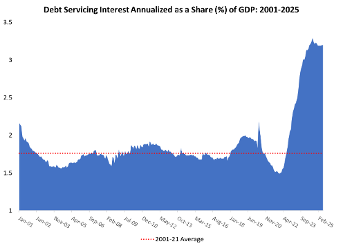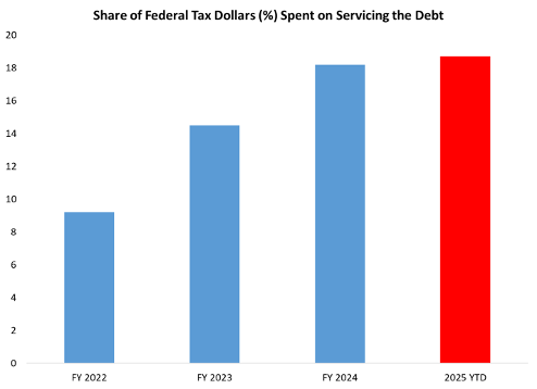 As interest rates and subsequent interest payments continue on an upward trajectory, a larger share of federal revenue is spent on servicing the debt. Figure 3 below shows that year-to-date almost 19 cents in every dollar of tax revenues collected was spent on servicing the debt. This is up from 18 cents in 2024, 15 cents in 2023, and 9 cents in 2022. In other words, we’re currently spending about twice the share of tax revenue on servicing the public debt than we were less than three years ago.