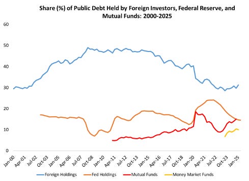 Understanding who holds the U.S. public debt reveals not only the financial structure behind government borrowing but also the potential economic and geopolitical vulnerabilities tied to our fiscal position. The data is available in the latest Treasury Bulletin (Table OFS-2). Up through the Great Financial Crisis, the dominant purchaser of U.S. treasuries was foreign investors (foreign governments, central banks, and foreign financial institutions). Between 2008 and 2015 about half of U.S. public debt was held by these foreign investors. However, from 2015 through 2023, the share of public debt held by foreign investors declined sharply, before stabilizing in recent years. Foreign investors now hold 31% of public debt. Figure 6 below shows the change in who holds U.S. public debt over the past 25 years, with the four largest purchasers. Notably mutual funds now hold more treasury debt than the Federal Reserve bank for the first time this century.