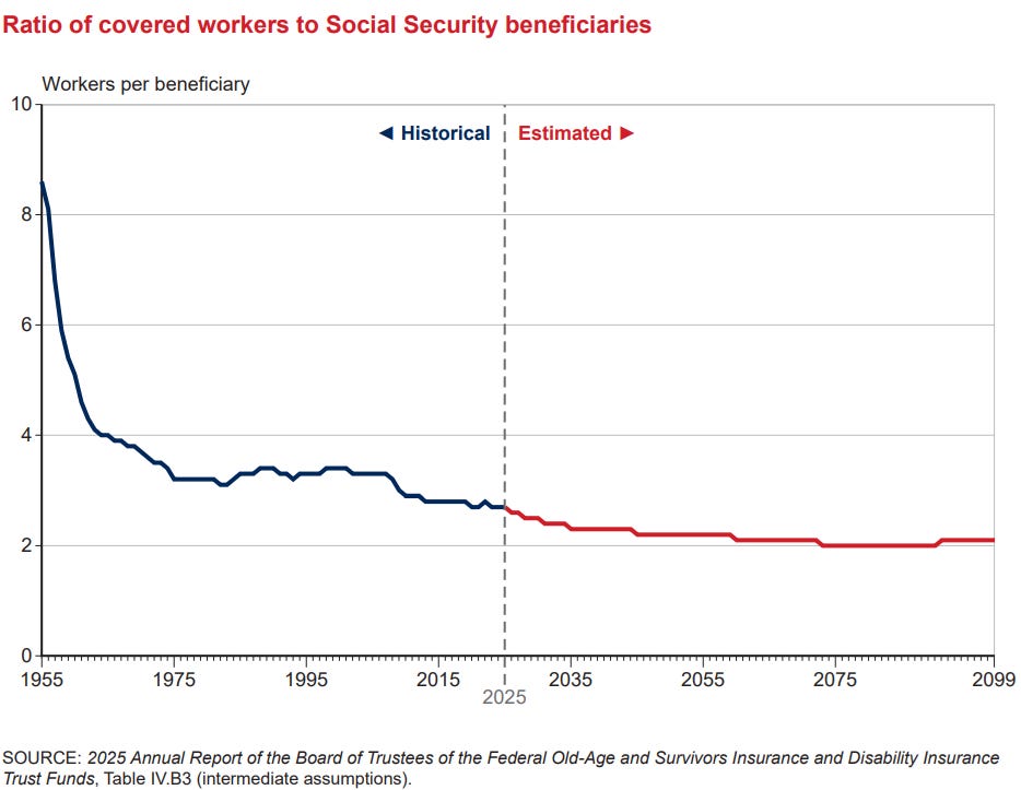 The fundamental challenge is straightforward: Social Security was designed for a different demographic reality. In 1955, nearly 9 workers supported every retired beneficiary. Today, that ratio has collapsed to 2.7 workers per beneficiary. By 2035, it will fall to 2.3 and continue declining thereafter, as shown in the figure below.