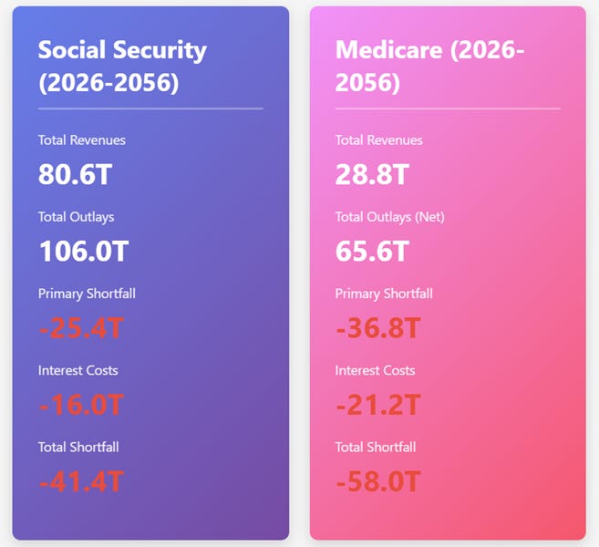 But Social Security doesn’t arrive at insolvency alone. As the illustration below shows, Medicare faces an even larger crisis, with a projected 30-year shortfall approaching $58 trillion when interest costs are included. Together, these programs face a combined shortfall near $100 trillion over the next three decades.