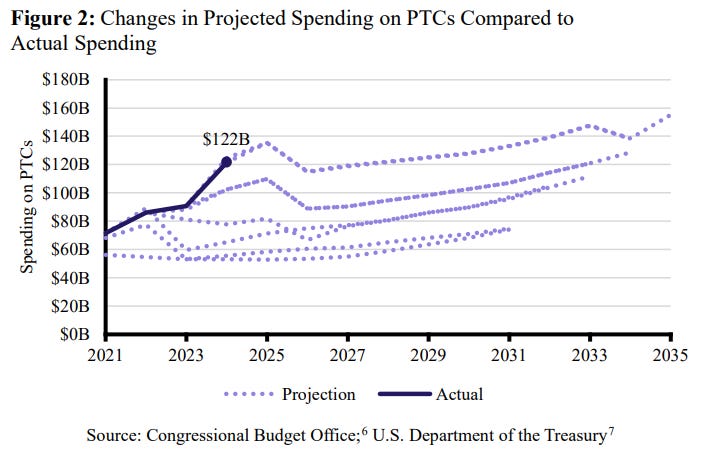 Even if the expansion ends as scheduled, 2026 spending will still be twice what was projected before ARPA, as the figure below from the JEC report demonstrates (PTCs = premium tax credits).